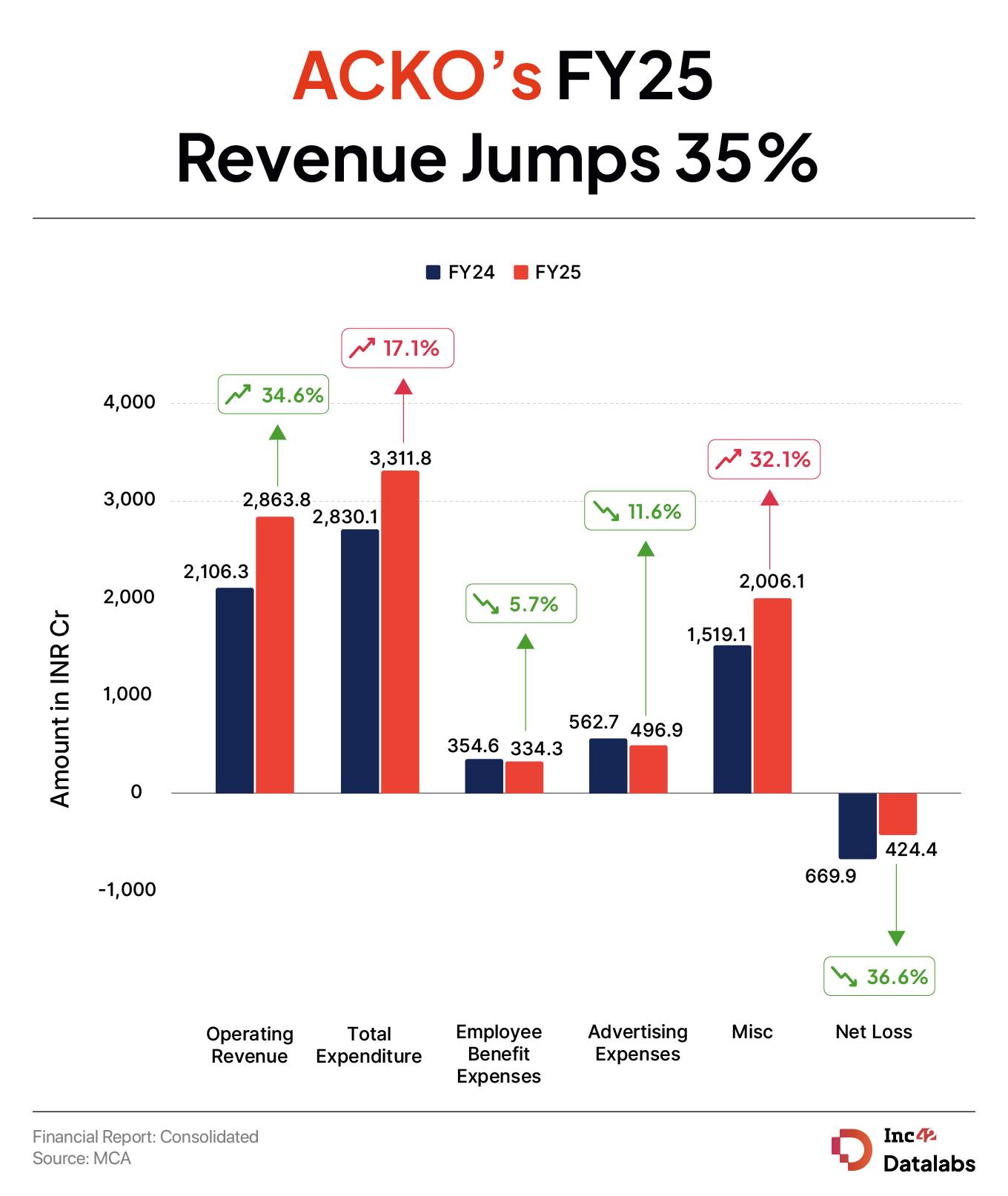 ACKO managed to trim its consolidated net loss by 36.7% to INR 424.4 Cr in FY25 from INR 669.9 Cr in the previous year