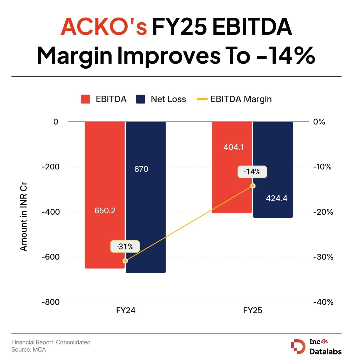 ACKO’s EBITDA loss narrowed to INR 404.1 Cr in FY25 from INR 650.2 Cr, while EBITDA margin improved to –14%  from -31% in the previous fiscal year