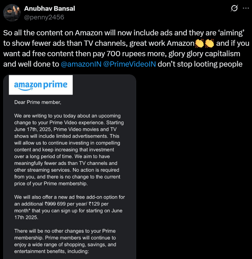 “What’s the point of subscription when I am seeing ads ?And what’s this new ad free sub? Is paying you for prime sub per year is not enough? Absolute mockery of consumers,” a post read on X.