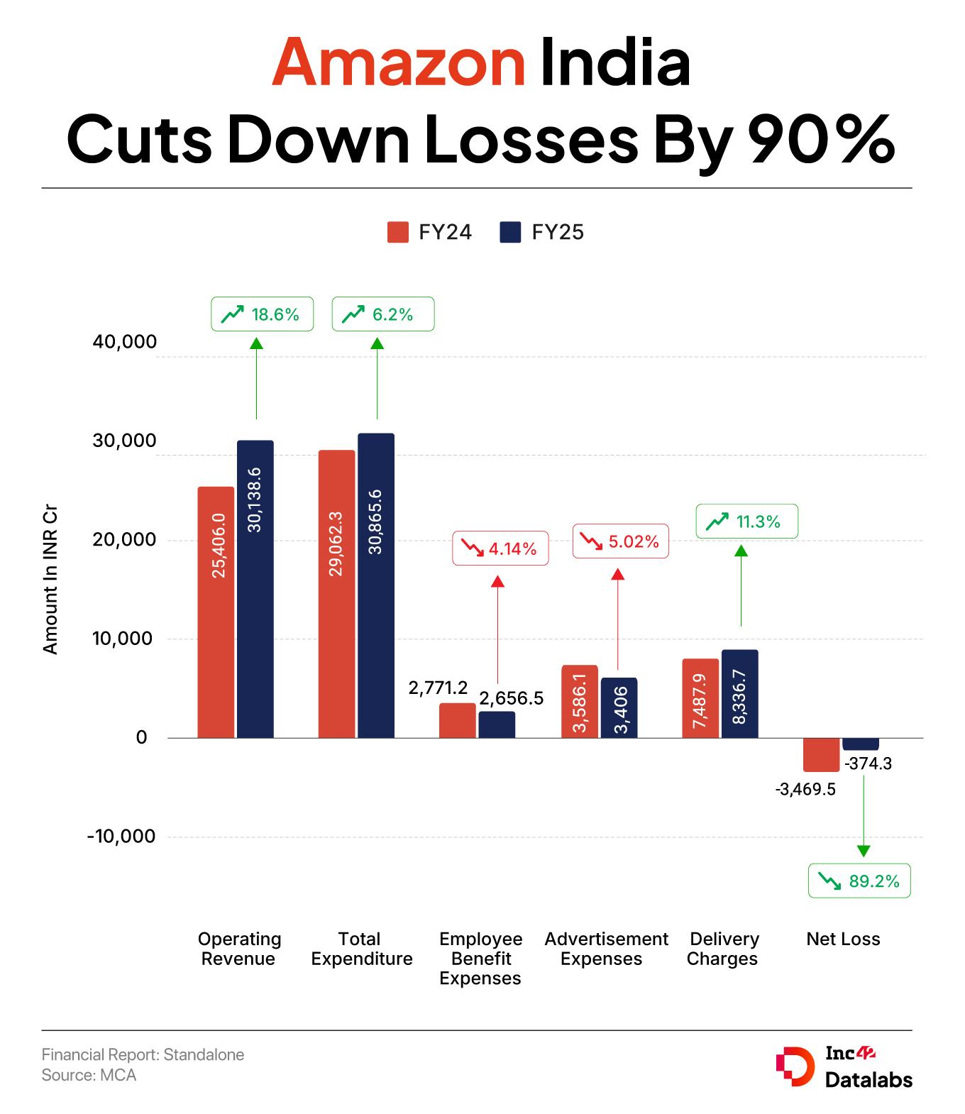 Amazon Seller Services reduced its losses in FY25 to INR 374.3 Cr, a nearly 90% decline from the INR 3,469.5 Cr loss recorded in the previous fiscal year