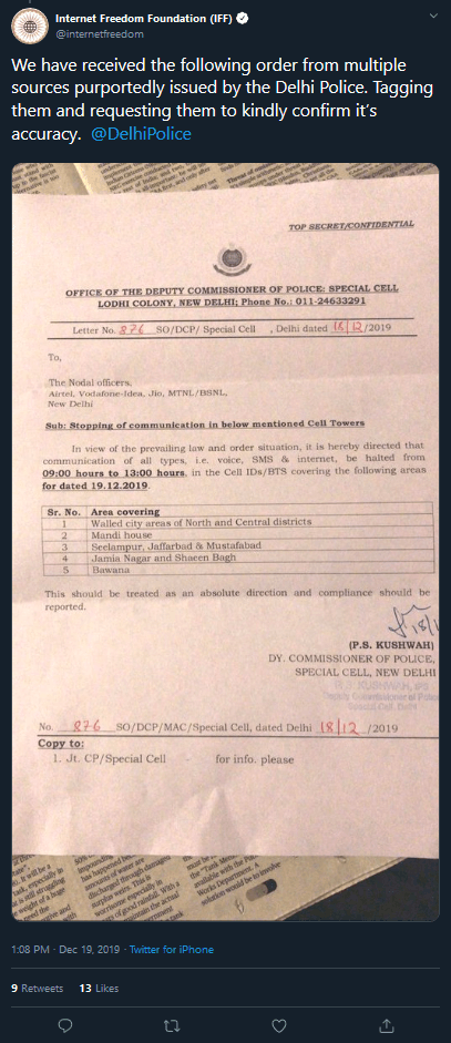 Meanwhile, the Internet Freedom Foundation has tweeted an image of the order from Delhi Police to telecom companies in the wake of planned protests. Vodafone India has also confirmed blocking internet and cellular services in parts of the city.