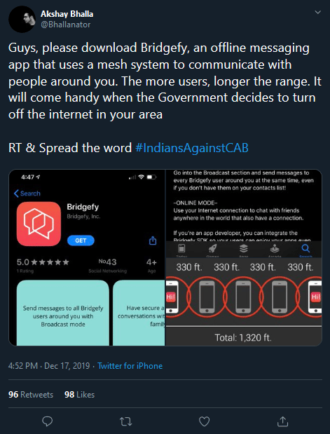 Meanwhile, social media users are urging protestors to use tools that do not rely on internet connections to spread messages. Bridgefy, an app that uses a mesh networking protocol for messaging has been recommended by many users.