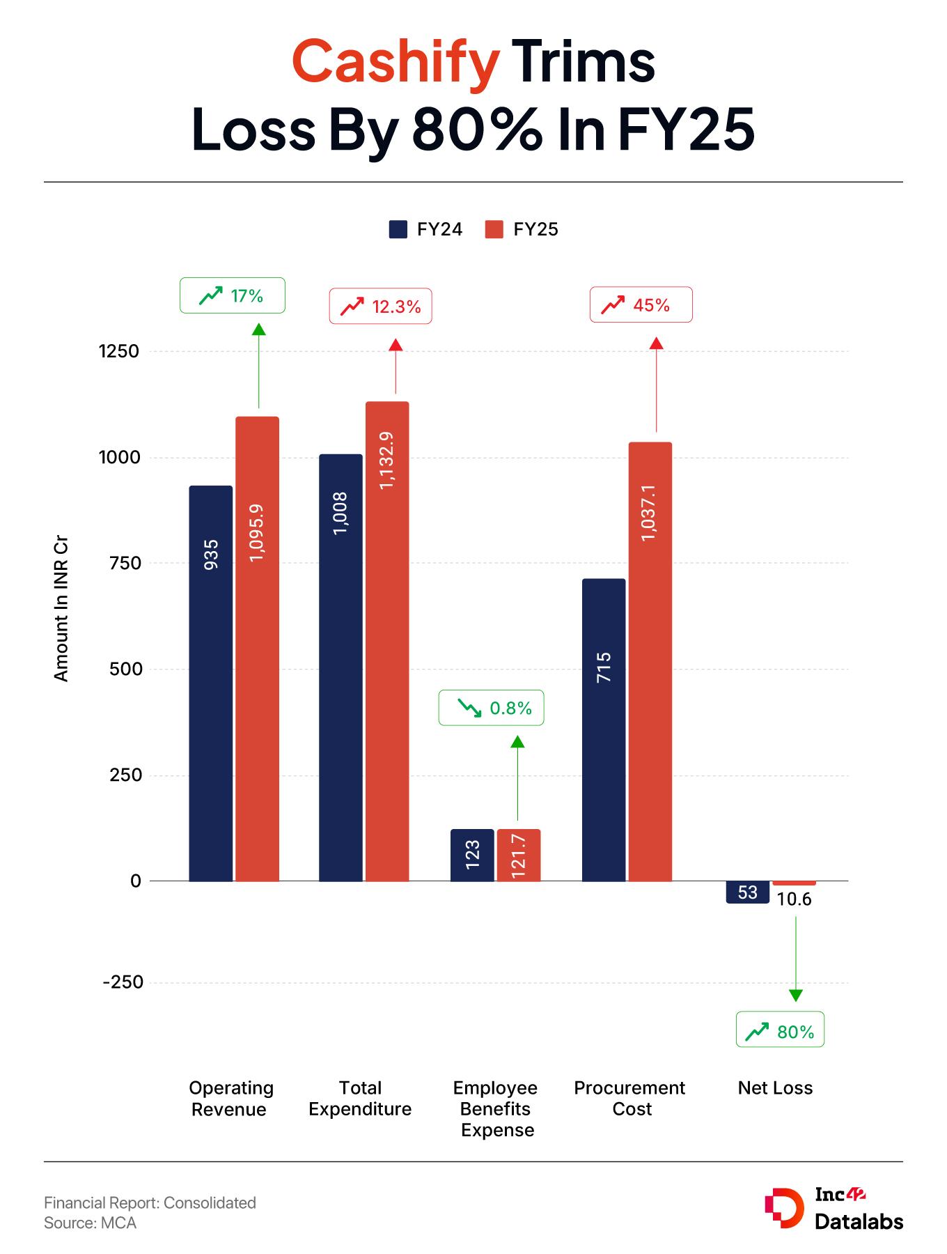 Including other income of INR 26.4 Cr, Cashify earned a total revenue of INR 1,122.3 Cr in FY25, up 17.5% from INR 954.8 Cr in the previous fiscal year.