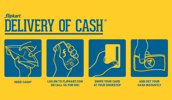“Two years after the launch of its era-changing Cash on Delivery option, Flipkart gears up to initiate its one-of-a-kind Delivery of Cash service. You no longer have to visit ATMs for that much needed money! Just go online or call our ever-ready personnel to get quick cash delivered home. And pay us with a simple swipe of your card!”