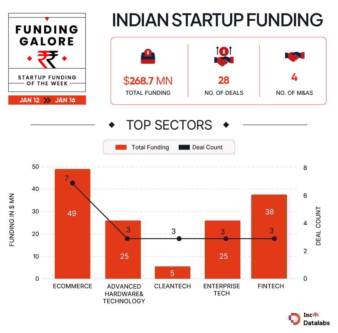 Indian startups cumulatively raised $268.6 Mn across 28 deals between January 12- 16,  marking a 293% jump from $68.4 Mn worth funds deployed in the Indian startup last week across 19 deals