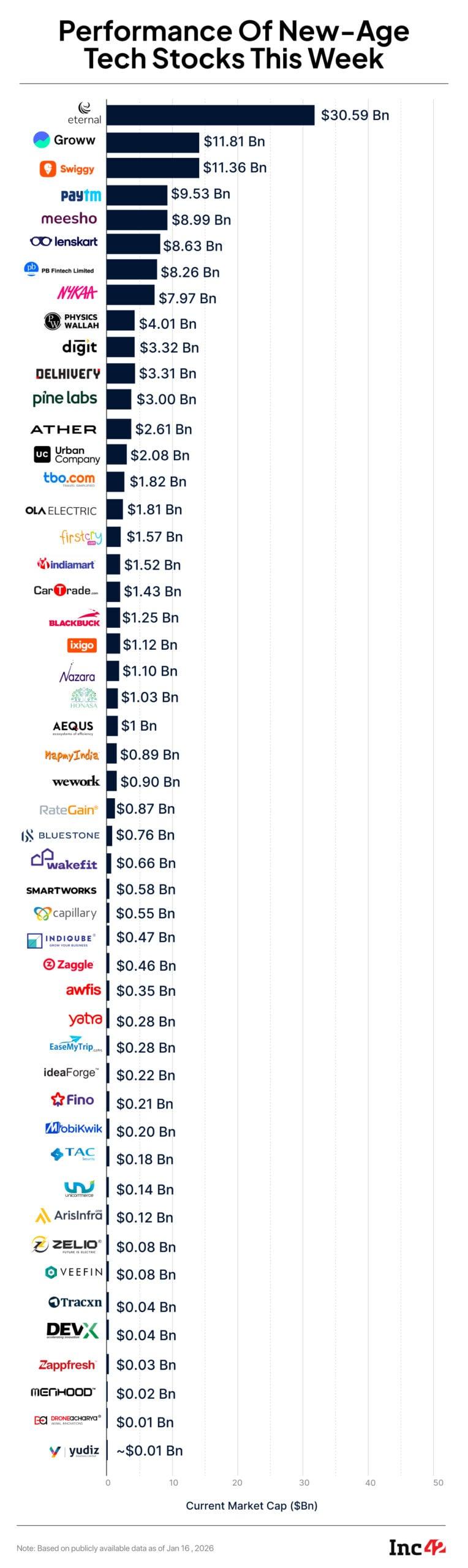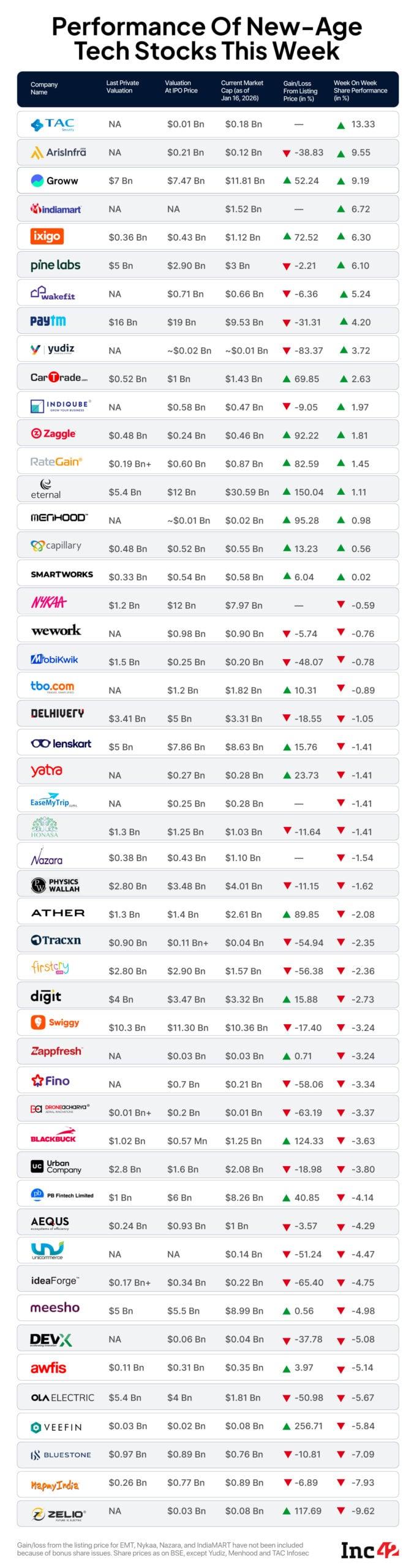 It was a bearish week for listed new-age tech companies amid the ongoing earnings season. During January 12-16, 33 of the 50 new-age tech stocks under Inc42’s coverage declined in a range of 0.59% to about 10%.