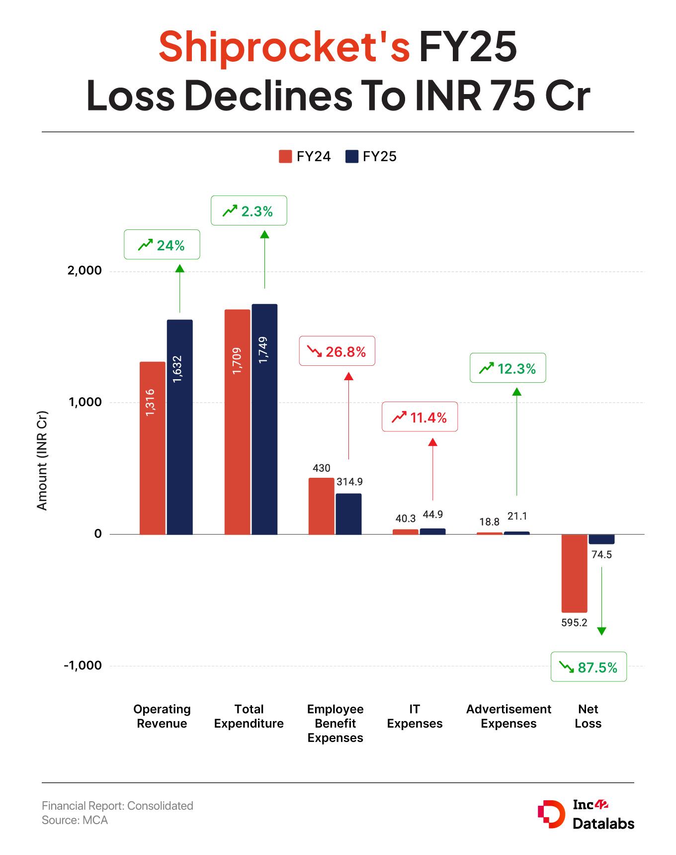 Shiprocket saw its consolidated net loss decline 87.5% to INR 74.5 Cr in the year ended March 2025 from INR 595.2 Cr in FY24, led by improvement in margins and revenue growth