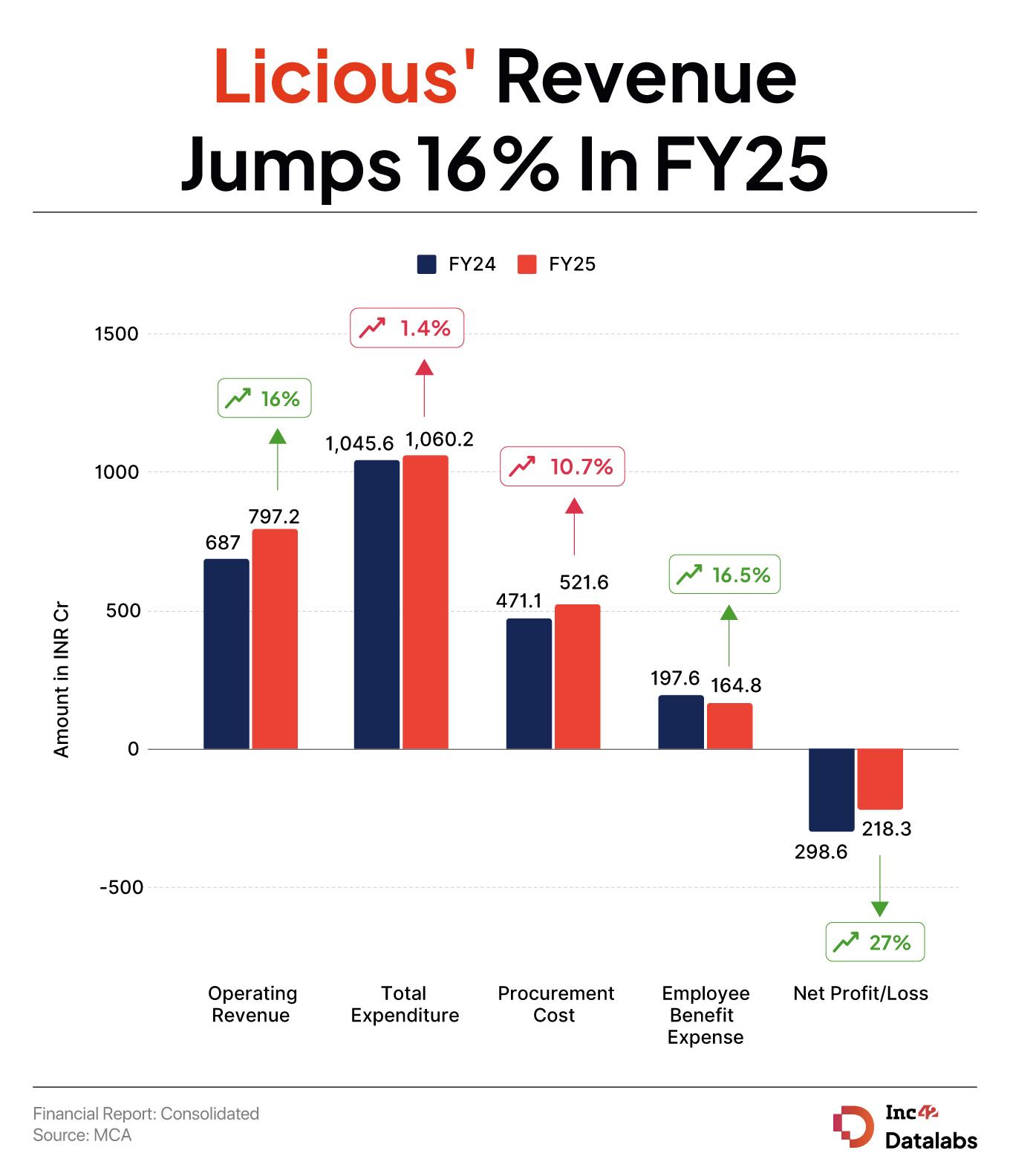 Licious’ operating revenue jumped 16% to INR 797.2 Cr during the year under review from INR 686.9 Cr in FY24