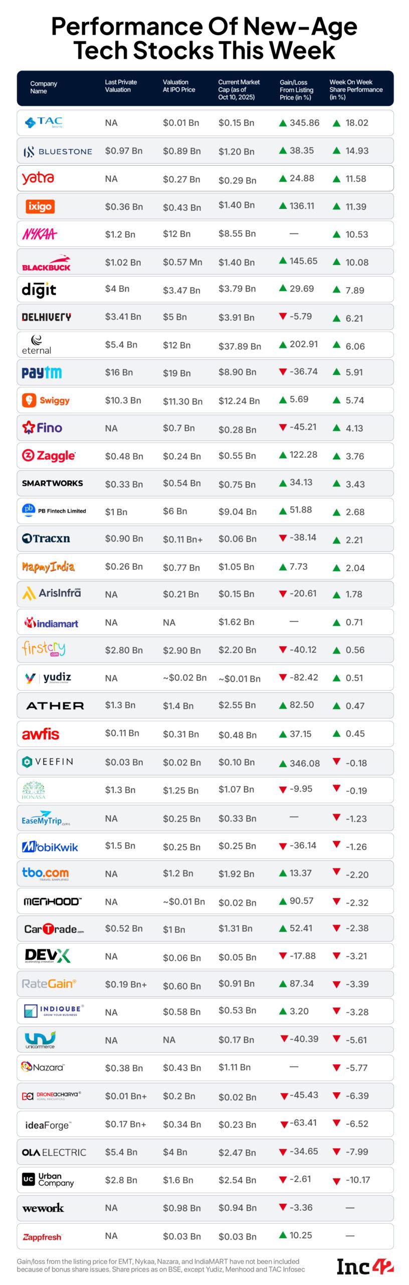 While BlackBuck, Eternal, BlueStone and Smartworks touched fresh all-time highs this week, Nykaa and Yatra touched their 52-week highs this week