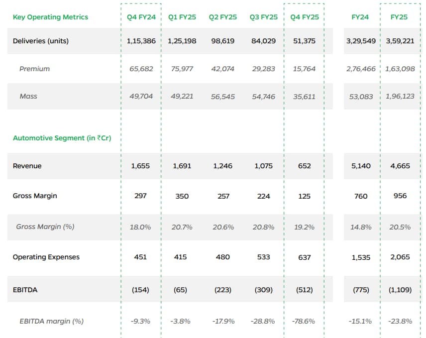 The reason behind the sharp decline in Ola Electric’s Q4 revenue was the fall in its sales. The EV maker, which retained its top position in the electric two-wheeler (E2W) market in India in FY25, saw a 56% YoY decline in deliveries to 51,375 units in Q4 FY25.