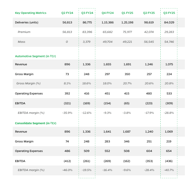 As per the company’s Q3 filings, Ola Electric delivered 84,029 escooters in the December quarter of FY25, down a little over 3% from 86,775 EV units delivered in the same quarter last year. However escooter deliveries fell nearly 15% from 98,619 units.