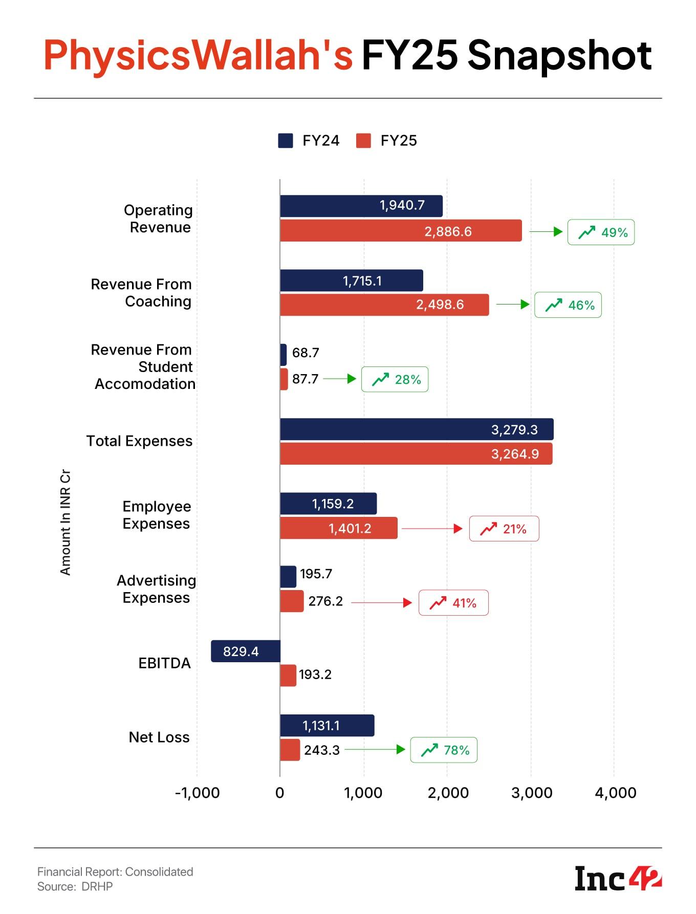 In the run up to its IPO, edtech major PhysicsWallah (PW) managed to narrow its consolidated net loss by 78% to INR 243.3 Cr in FY25 from INR 1,131.1 Cr in the previous fiscal year. However, the loss in FY25 was still nearly 3X of INR 84.1 Cr loss it posted in FY23.