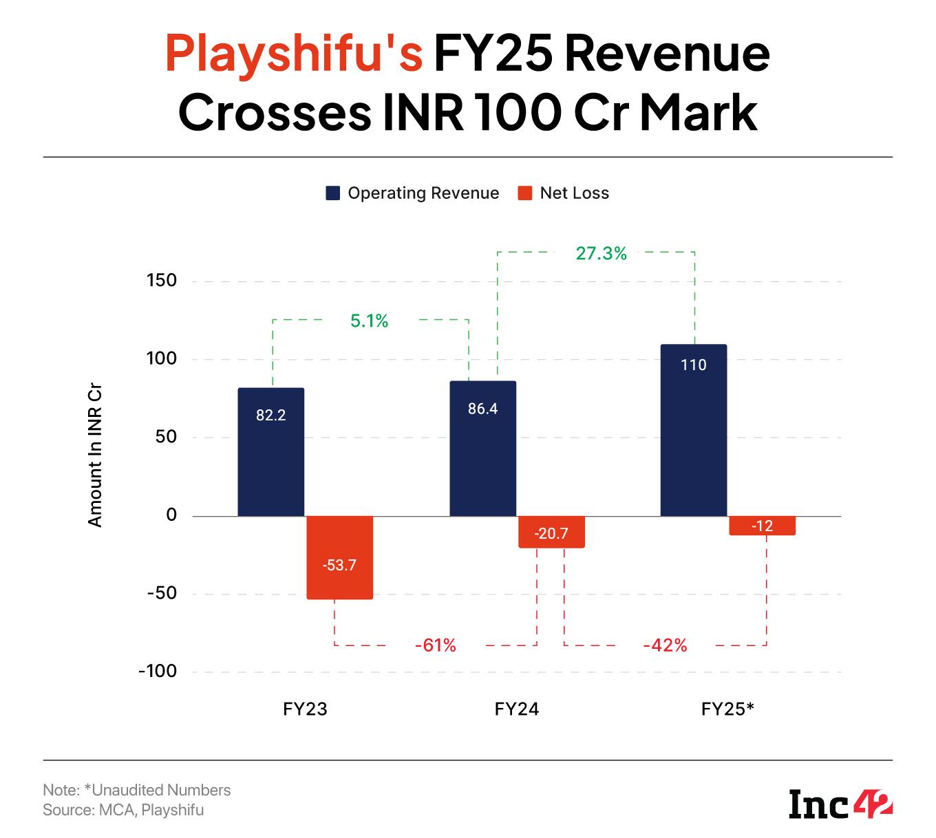 PlayShifu posted an operating revenue of INR 110 Cr in FY25. This would be an increase of 27.3% from INR 86.4 Cr in FY24