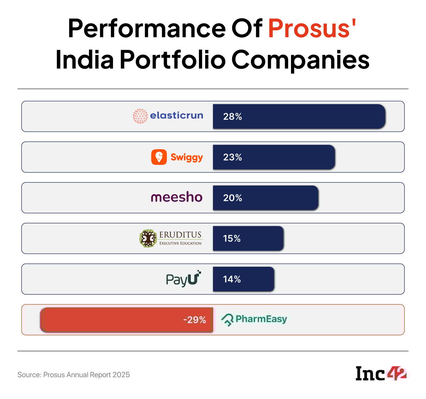 While Swiggy’s IRR stood at 23%, that of Meesho was at 20%. However, Prosus ascribed a negative IRR of 29% to PharmEasy, which has been in financial muddle in recent times. The epharmacy’s investor Janus Henderson cut the valuation of the company by 92% to $456 Mn in December 2024, a far cry from its peak valuation of $5.6 Bn. Prosus owns about 11.1% stake in PharmEasy.