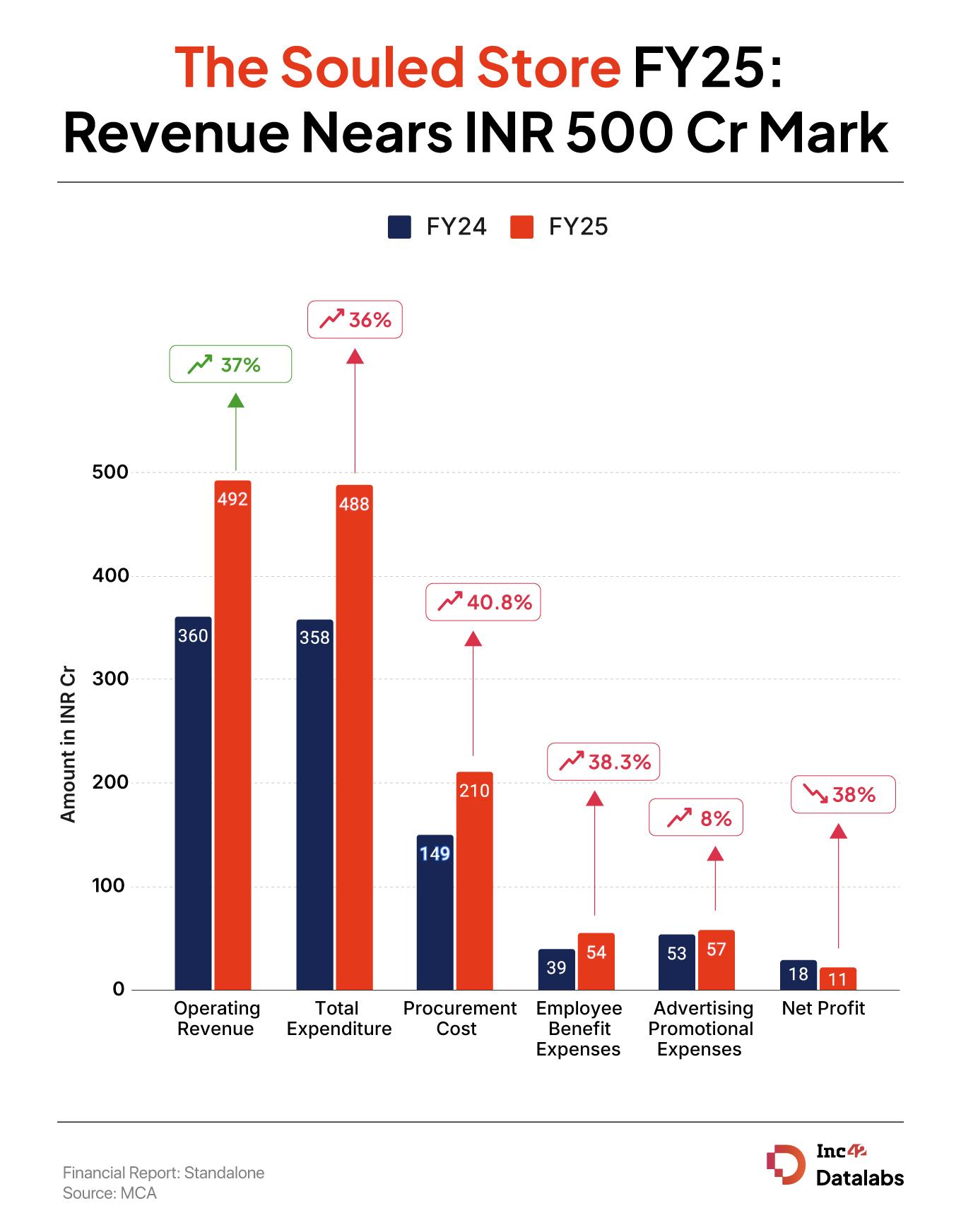 The Souled Store’s net profit declined 38% to INR 11 Cr in FY25 from INR 17.7 Cr, reflecting the absence of a tax credit booked in FY24
