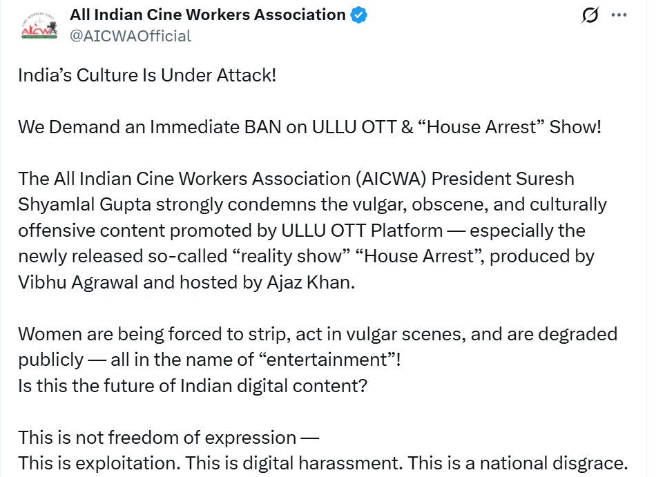 “NCW takes suo moto cognizance of obscene content on Ullu App’s show House Arrest. Viral clips show women being coerced into intimate acts on camera. NCW slams the platform for promoting vulgarity & violating consent. CEO & host summoned on May 9,” the commission said in a post on social media platform X.