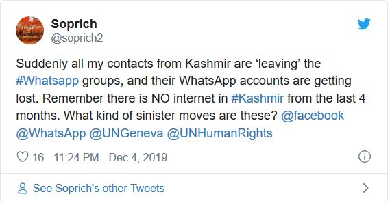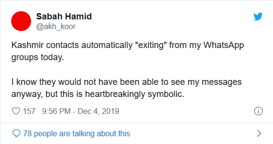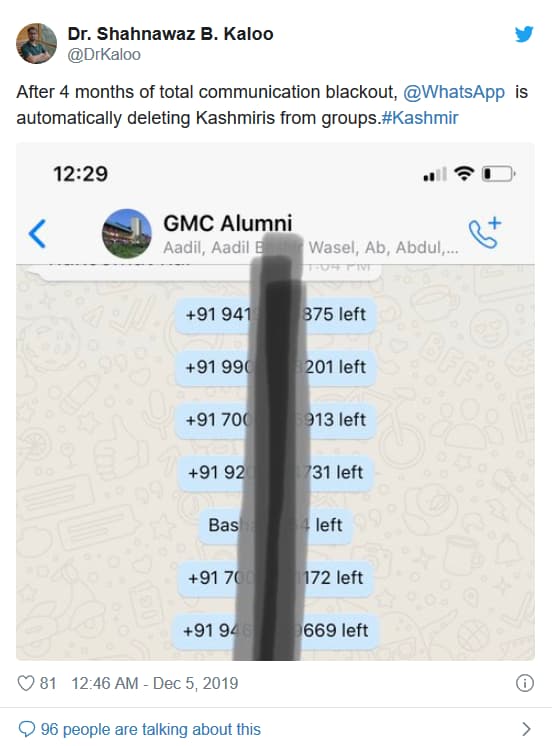 Kawoosa, who hails from J&K, said that on Wednesday (December 4) night he saw friends and family members getting automatically kicked out of WhatsApp groups. “My school and family WhatsApp groups painted a very weird picture on Wednesday as suddenly at the same point I saw various members being reported as left,” he added.