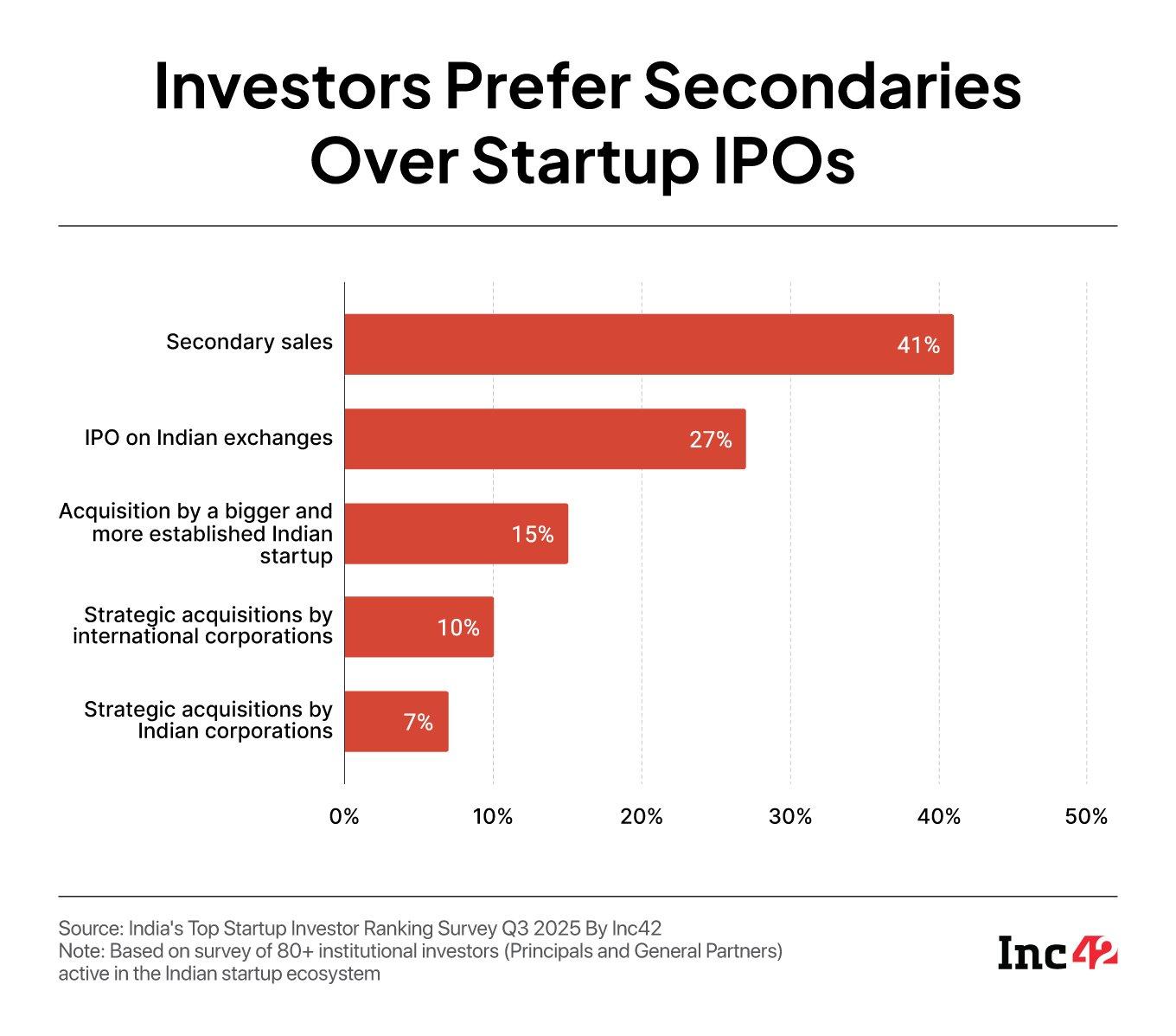 Nearly 41% of India investors prefer secondary deals as a route to exit their portfolio companies as per a survey conducted by Inc42 as a part of its Indian Tech Startup Funding Report Q3 2025