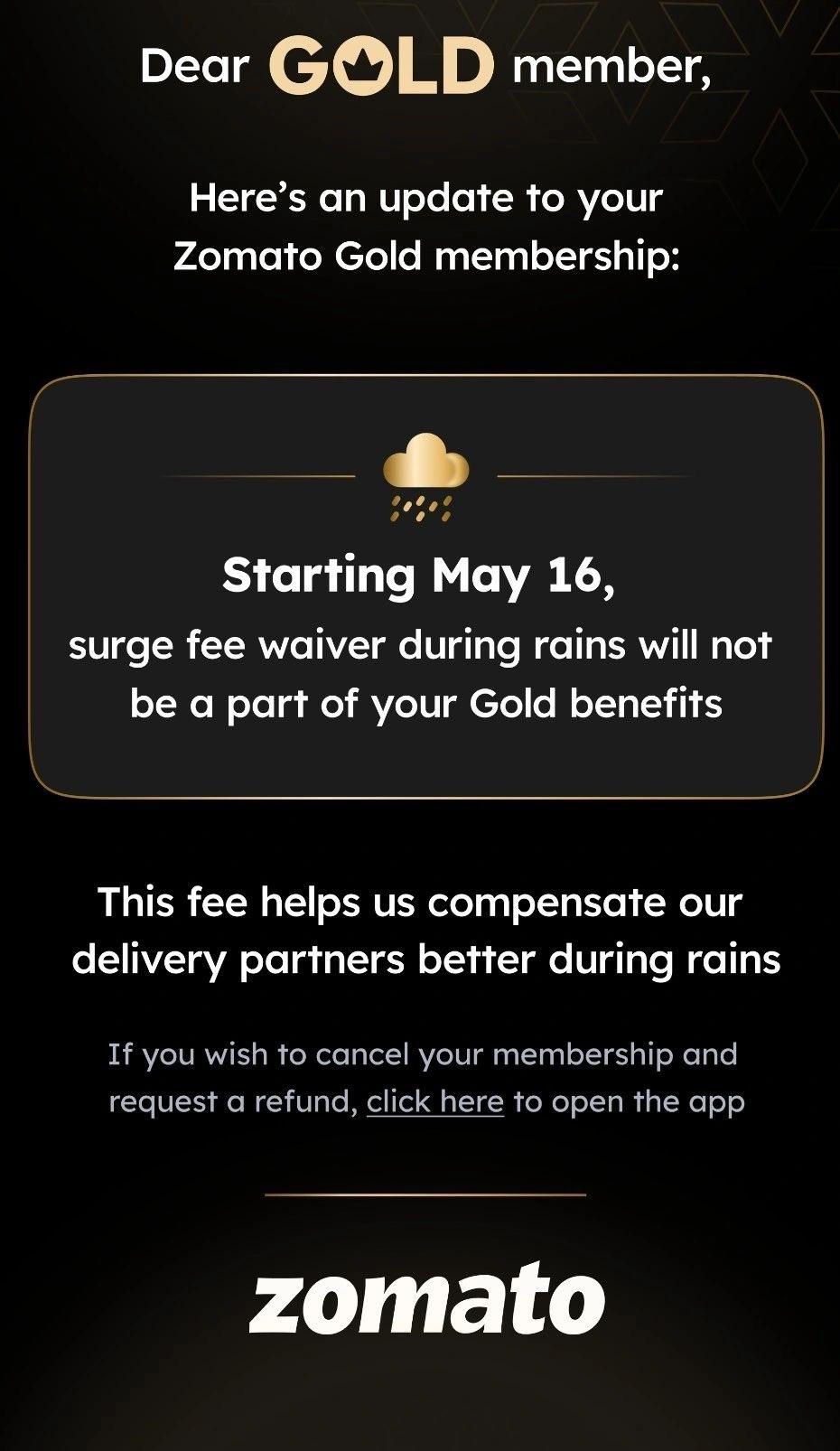 In the notification, Zomato said, “Starting May 16, surge fee waiver during rains will not be part of your Gold benefits.” It further added, “This fee helps us compensate our delivery partners better during rains.”