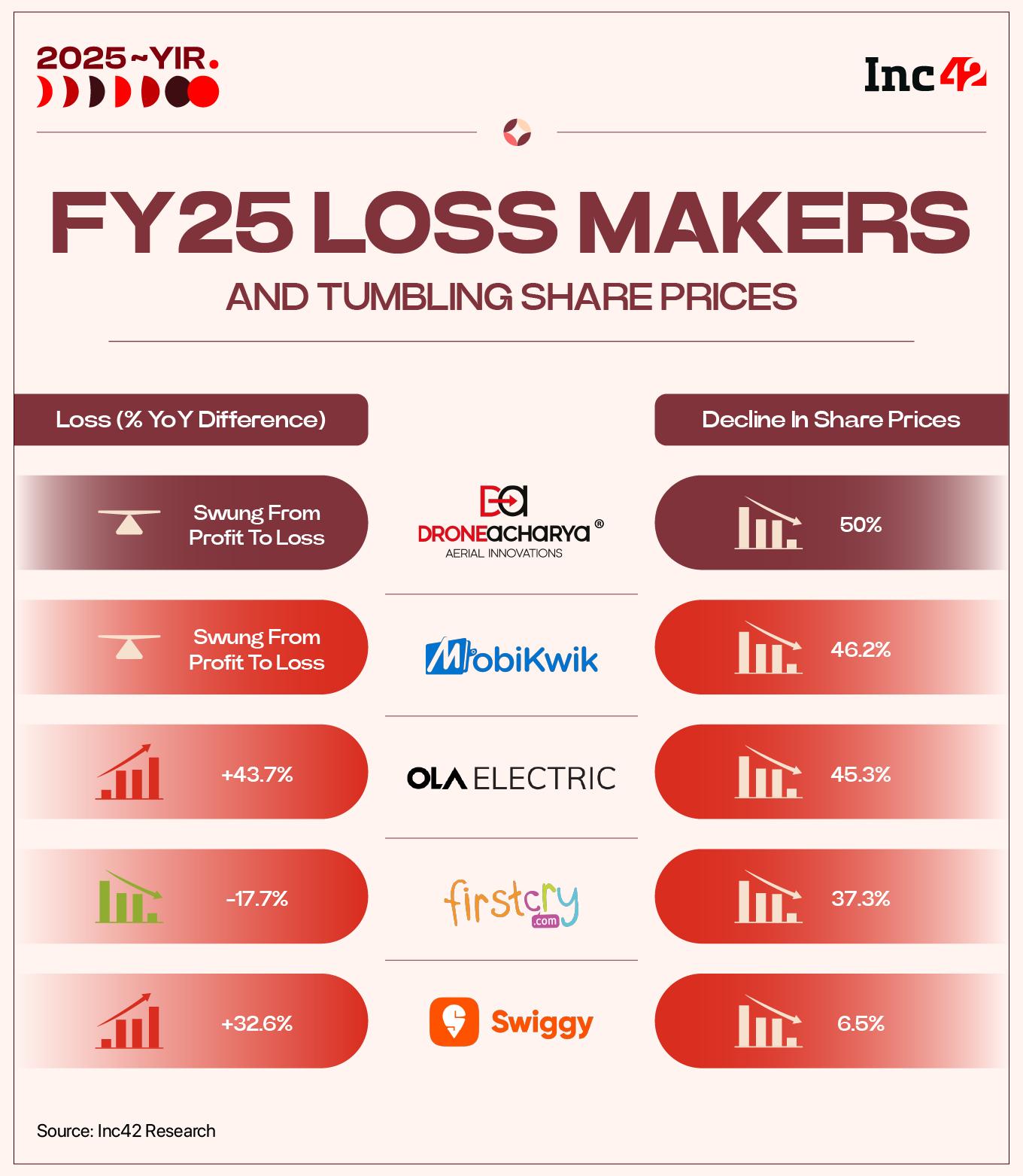 Ola Electric, which listed in August 2024 at a peak valuation of over INR 35,000 Cr, ended 2025 with its market cap down to INR 17,000 Cr, a 50% erosion from its January 2025 high of INR 148 per share. The company’s net loss for FY25 widened more than 40% to INR 2,276 Cr, while its revenue slumped 9% to INR 4,645 Cr.