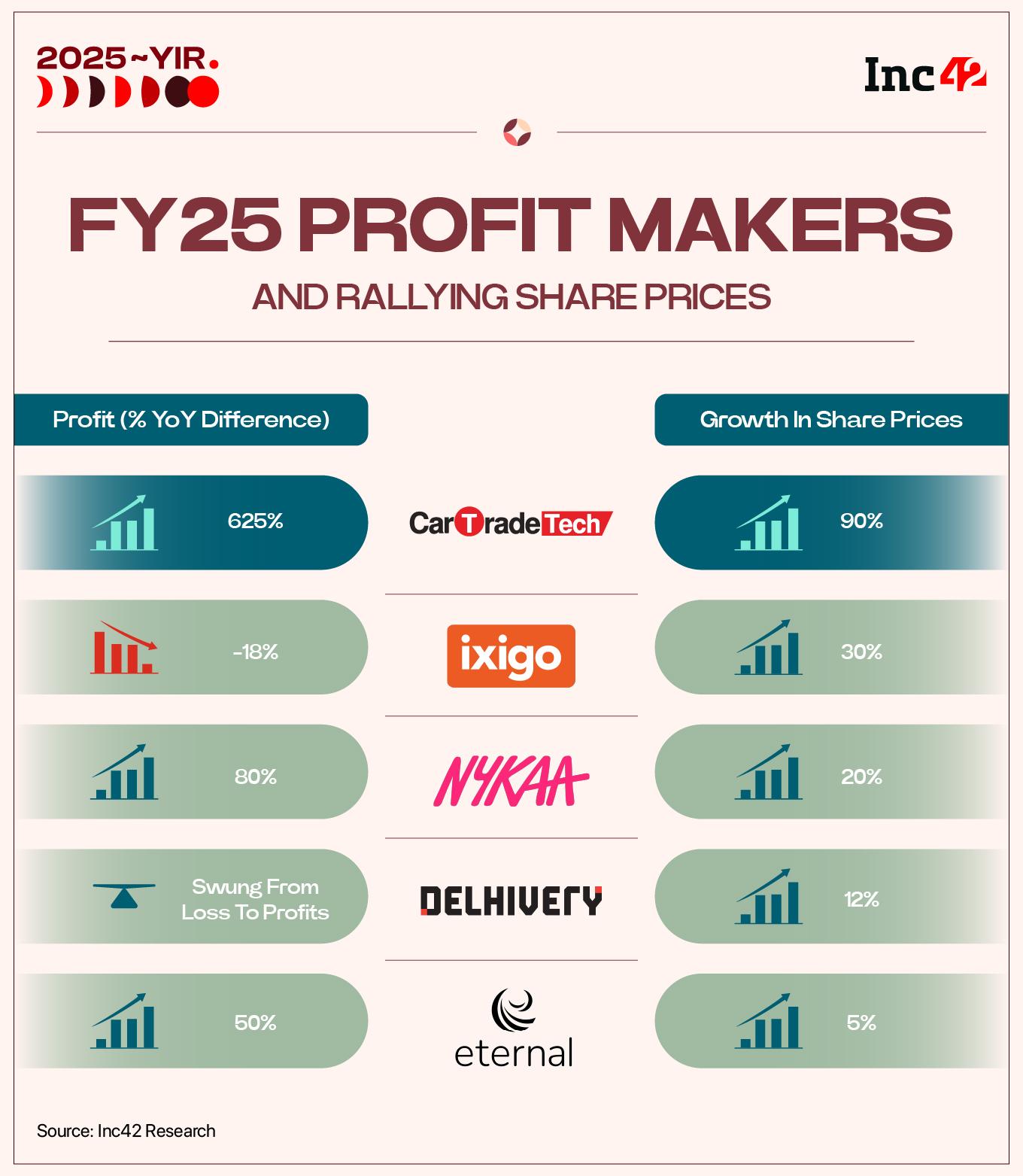 And on the other, companies like Eternal, Nykaa, Paytm and Ixigo either flipped to profitability or delivered such sharp swings in unit economics that investors rewarded them with multiple expansion and share-price gains of 30-100% even as the year saw scarce movement in the broader market.