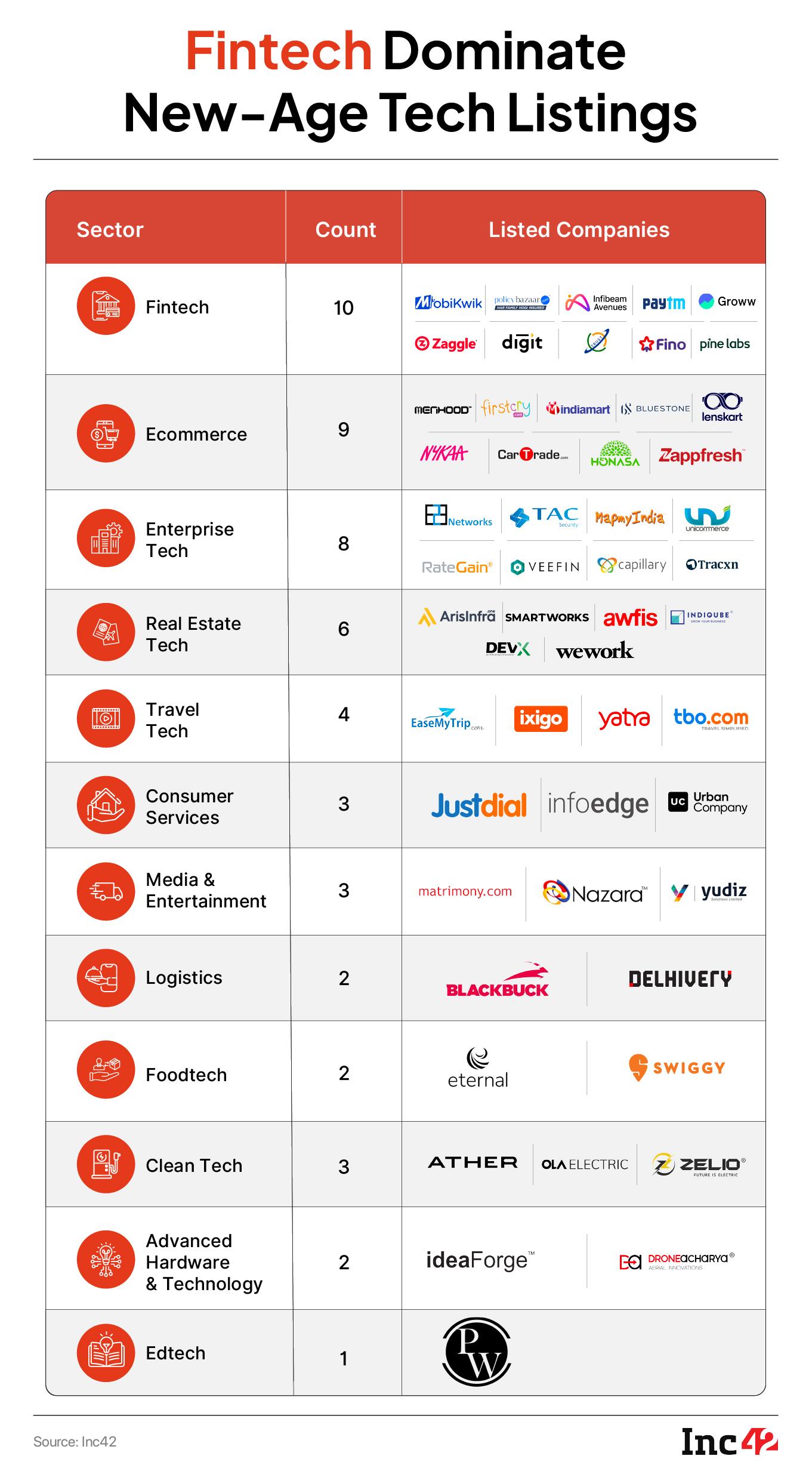 While fintech sector has accounted for eight public listings till date, ecommerce and enterprise tech sectors are close behind with seven each