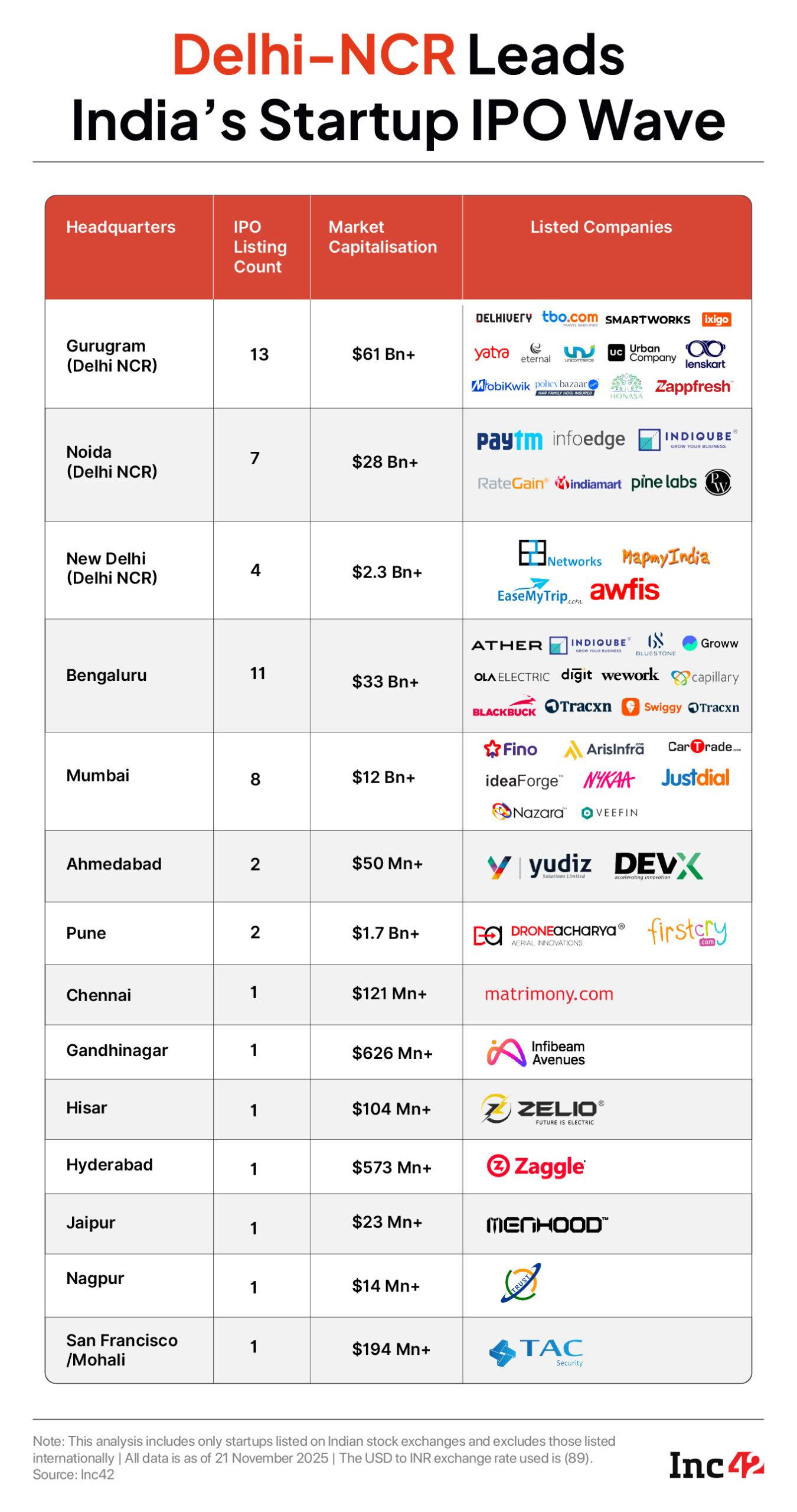 While nine companies, including Eternal, Delhivery, and PB Fintech, call Gurugram their home, Awfis, EaseMyTrip, MapmyIndia and E2E Networks are from Delhi. Noida on the other hand is home to four listed new-age tech companies, including Paytm and Info Edge.