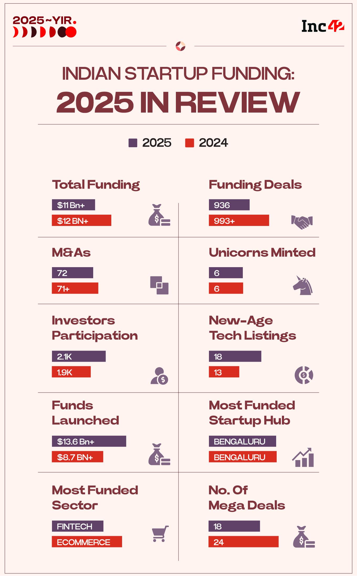 Indian Startups cumulatively raised about $11 Bn across 936+ deals during the year, down about 8% from $12 Bn raised across 993 deals in 2024
