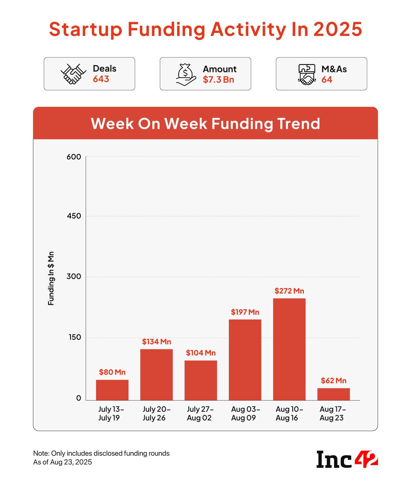 Investors Hold Back Cash: Indian startups raised just $62.2 Mn this week, a steep 77% drop from last week’s $272 Mn. Ecommerce led with $33.6 Mn, while seed funding nosedived 84% to $2 Mn across four deals.