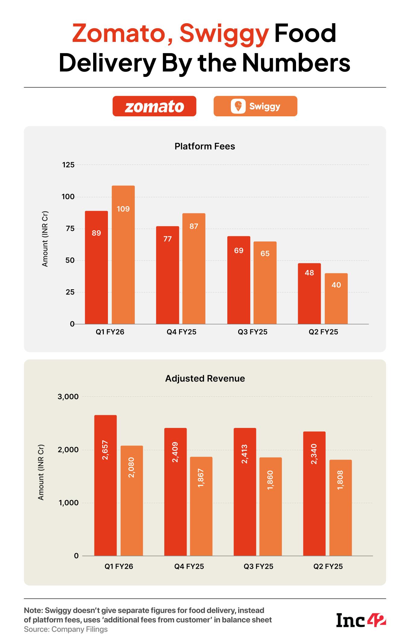 Zomato mopped up INR 89 Cr in Q1 of FY26 from platform fees in the food delivery business and included it in its revenue, while Swiggy earned INR 109 Cr in the same quarter, though it doesn’t use the term, instead, calls it “additional fees from customers”. Swiggy, however, did not give a breakup of earning from food delivery and quick commerce.