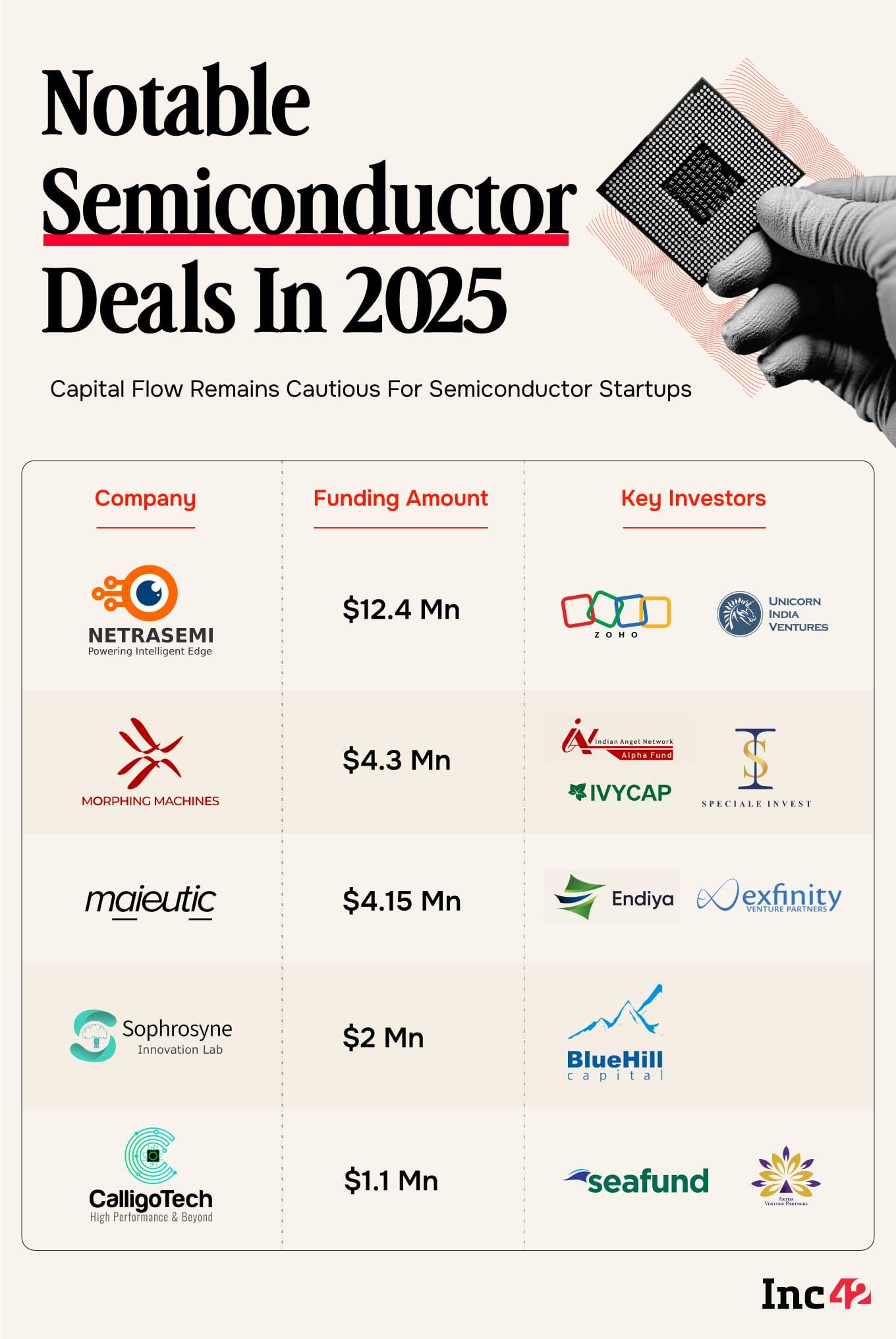 In 2025, semiconductor startups raised roughly $50 Mn, according to Inc42’s annual funding report. In 2024, this amount was $28 Mn+ and a mere $5 Mn+ in 2023.