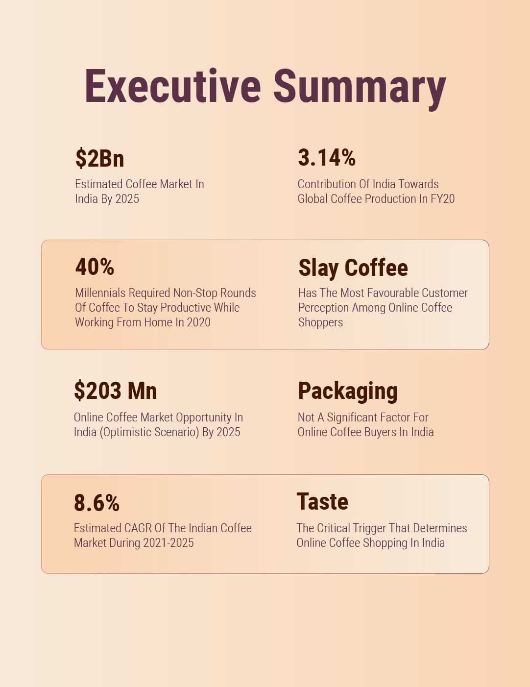 Although traditional players such as Nestlé, Hindustan Unilever, Tata Coffee and others offer instant coffee and currently dominate the Indian market, new-age D2C players like SLAY Coffee, Rage Coffee and Blue Tokai have also entered this space, aiming to enhance consumer experience through new flavours, blends and aromas and new modes of cultivation and processing. According to the Mordor intelligence report, the Indian coffee market is currently valued at $1.46 Bn and poised to touch $2.03 Bn by 2025.