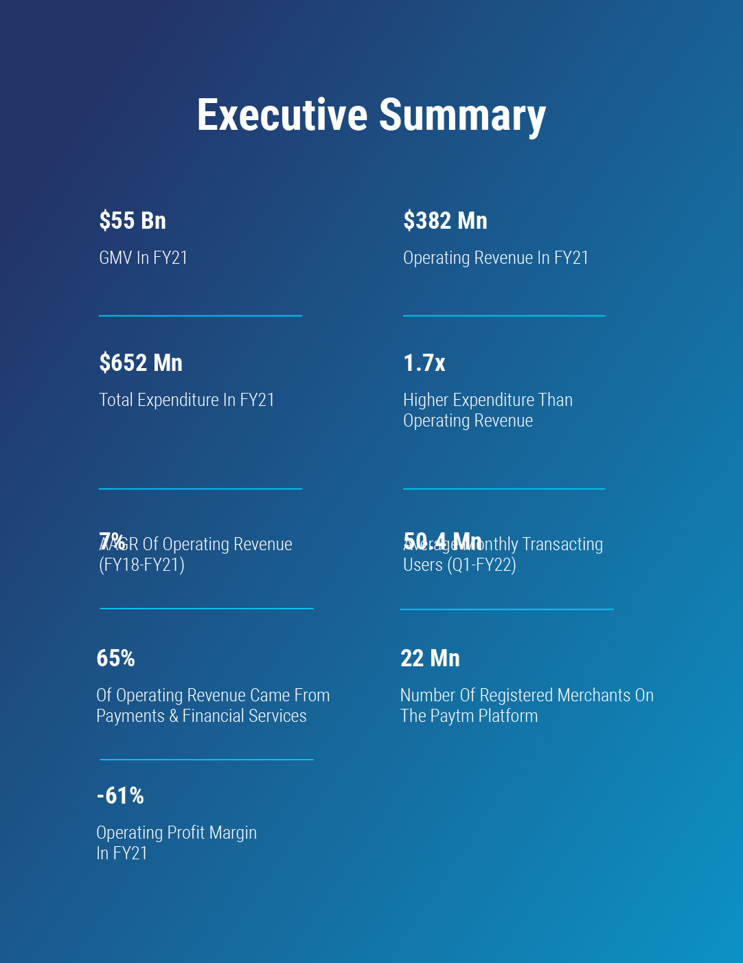 Over the years, the fintech market in India has expanded beyond money transfers and bill payments. Paytm , an application which was launched primarily as a mobile wallet to facilitate money transfers and mobile recharges, today offers an array of services ranging from equity investments to insurances indicating that full-stack fintech applications are the need of the hour in the Indian digital economy. Backed by the likes of SoftBank, Alibaba Group, T. Rowe Price and others. Paytm clocked in a total operating revenue of $382 Mn in FY21. Compared to FY19 the operating revenue of the company has tanked by 13% primarily due to the diminishing share of revenue from commerce and cloud services over the same period. The revenue from commerce and cloud services of the company took a major hit due to the pandemic and witnessed a decrease in revenue share from 47.5% (in total FY19 revenue) to 25% in the total FY21 revenue. However, the share of payments and financial services increased by 22 percentage points from 52.5% (in FY19 ) to 75% (in FY21).