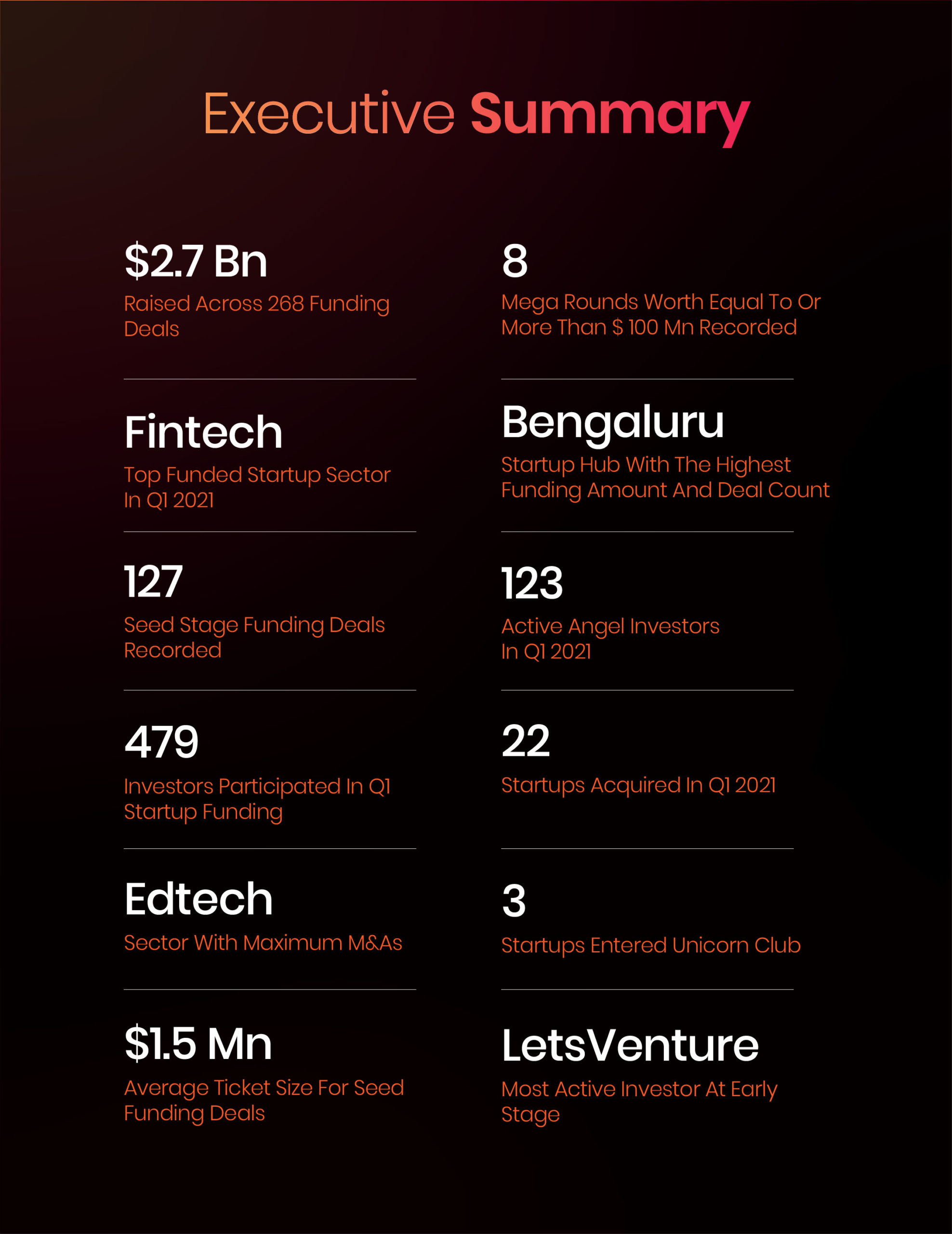 In the first quarter of CY2021, Indian startups raised $2.7 Bn from 268 funding deals. However, the funding amount was 12% lower than the quarterly average (2017-2020) of $3.1 Bn.