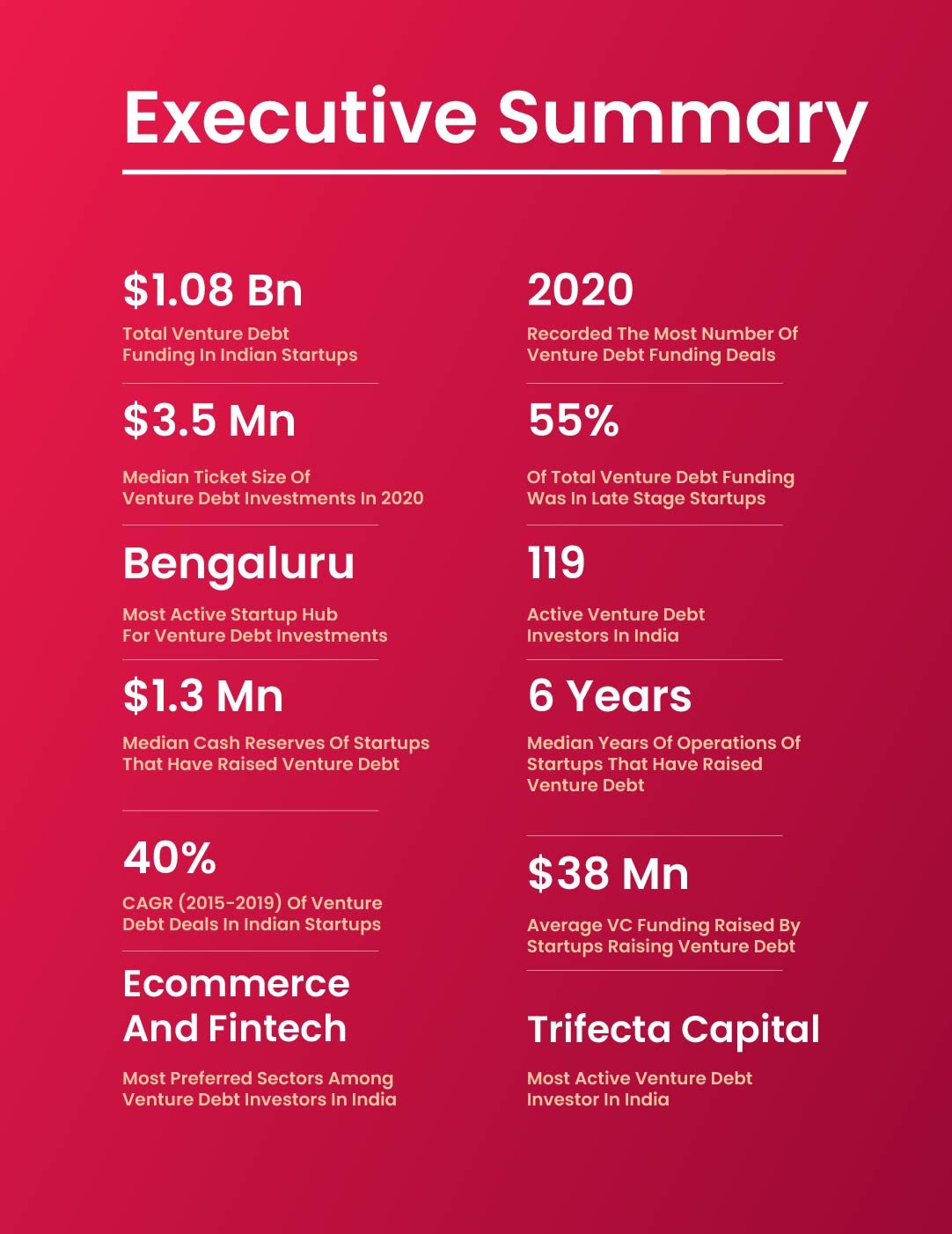 Inside India's Startup Venture Debt Funding Boom, Report 2021 provides a comprehensive study on the following— historical funding trends, average deal size, financial benchmarking of cash reserves and earning power of startups who have raised venture debt between 2015 to 2020.