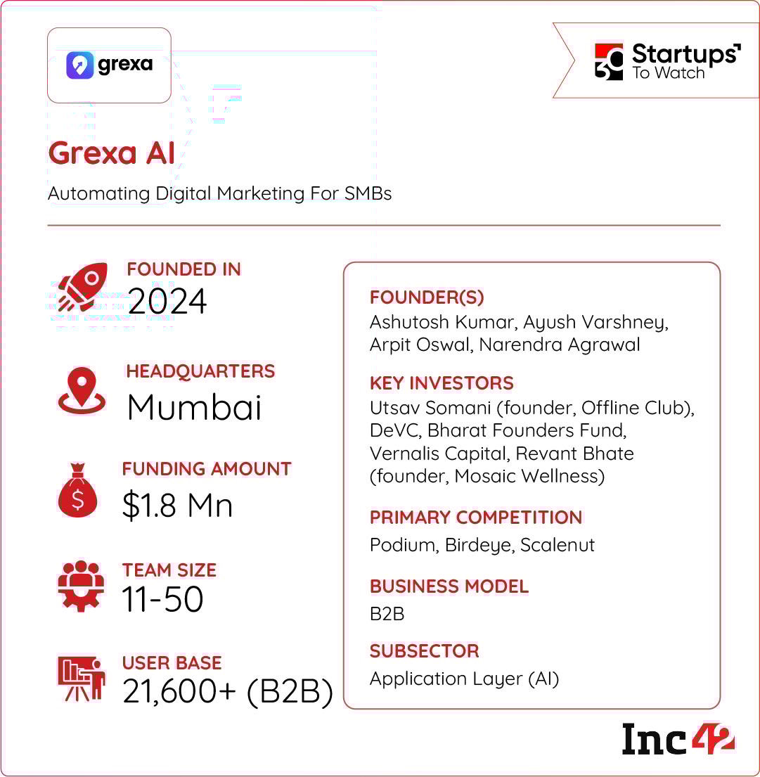 Launched last year by Testbook’s founding team of Ashutosh Kumar, Narendra Agrawal, Ayush Varshney and Arpit Oswal, Grexa AI is building an all-in-one AI marketing platform to power the digital transformation of India’s small businesses.