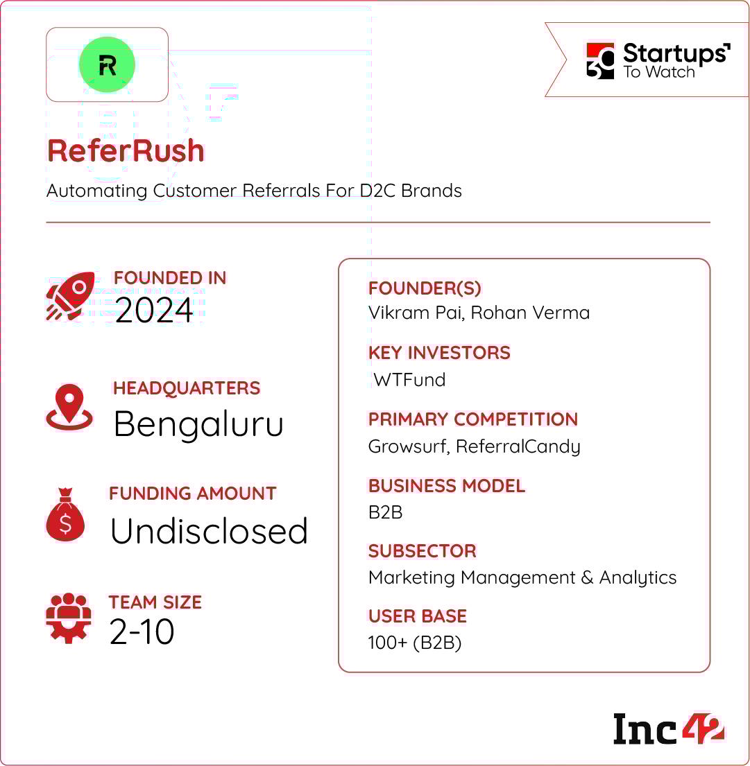 Founded in 2024 by Vikram Pai and Rohan Verma, ReferRush is a SaaS startup focussed on referral marketing for D2C and ecommerce brands. The platform helps businesses drive revenue through word-of-mouth by automating customer referrals, boosting conversions, and improving sales through socially trusted recommendations.