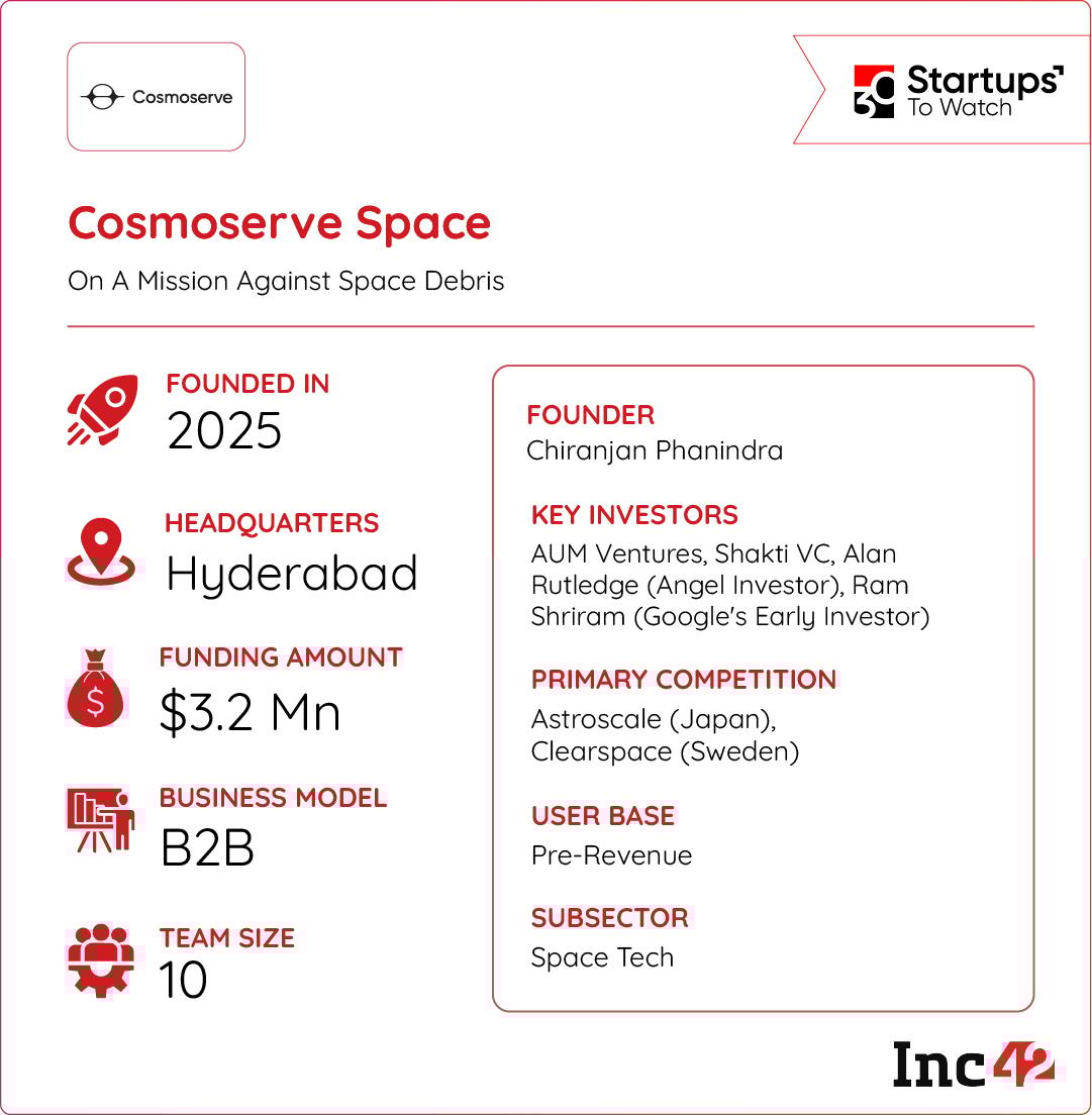 Cosmoserve Space, founded earlier this year by ISRO veteran and IIT-Madras alumni Chiranjeevi Phanindra B, is developing technology to clean Earth’s orbit. The startup is designing a retriever spacecraft to identify, track and clear hazardous objects, ensuring long-term operational safety for satellites and space missions.