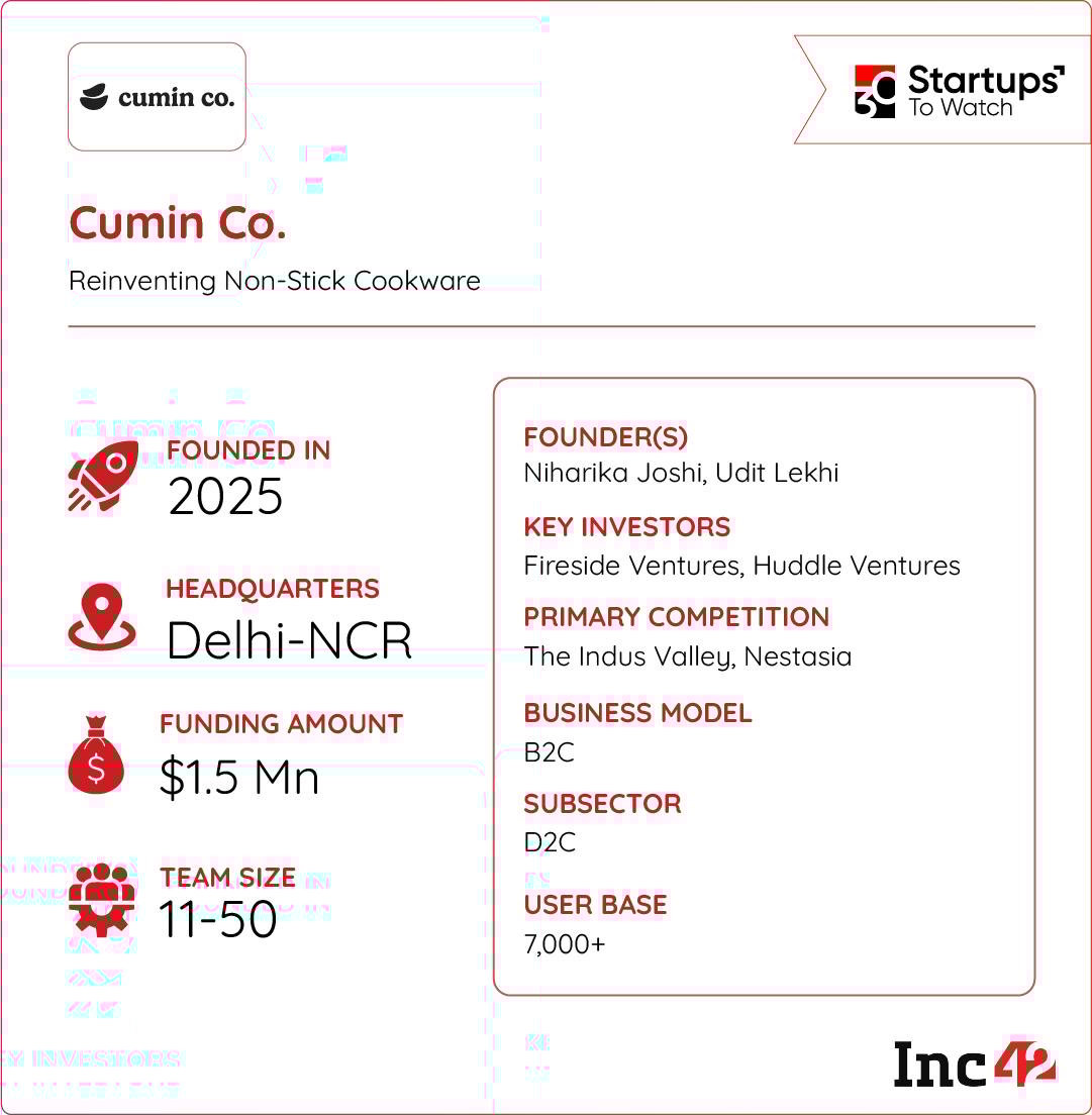 Cumin Co., founded in 2024 by ex-Noise VP Niharika Joshi and ex-Mastercard director Udit Lekhi, offers toxin-free, enamel-coated cast iron cookware.