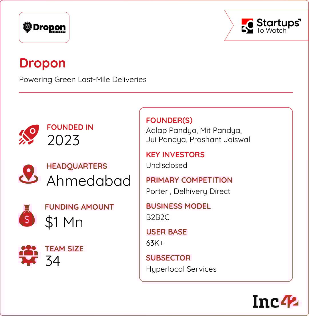 Founded in 2023 by Ahmedabad-based techies Prashant Jaiswal, Aalap Pandya, Mit Pandya and Jui Pandya, Dropon offers on-demand hyperlocal deliveries powered entirely by EVs. The platform connects customers with delivery partners, Green Superheroes, who ensure fast, eco-friendly, and reliable deliveries.