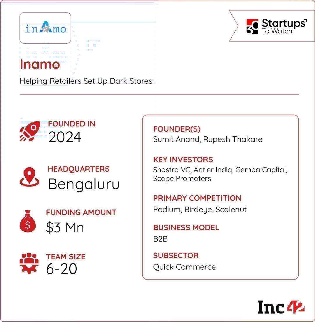 Founded by former Dunzo VP Sumit Anand and ex-ApnaKlub product head Rupesh Thakare in 2024, Inamo enables businesses to efficiently set up, scale, and optimise their dark store networks.