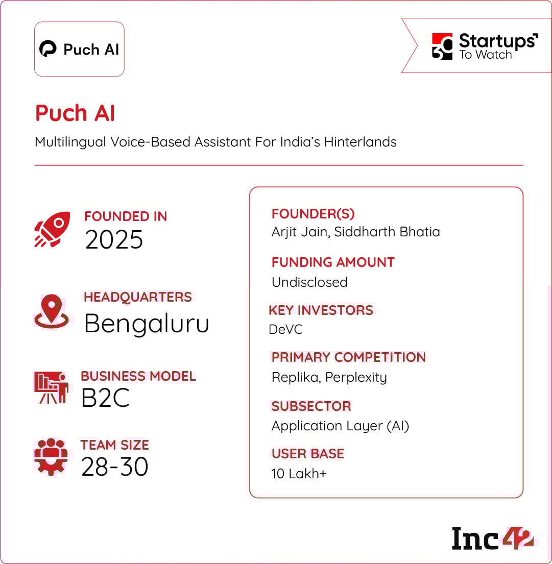 Founded in 2025 by Siddharth Bhatia and Arjit Jain, Puch is building a multilingual voice-based assistant that works directly on two of the most universal communication channels in India – WhatsApp and phone calls.