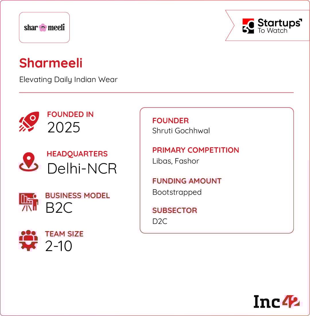 Founded in mid-2025 by ex-Zappfresh cofounder Shruti Gochhwal, ex-Army major Santosh Galidevara and Renu Solanki, Sharmeeli is a D2C ethnic fashion brand. It offers sarees, suits, shararas and other Indian wear.