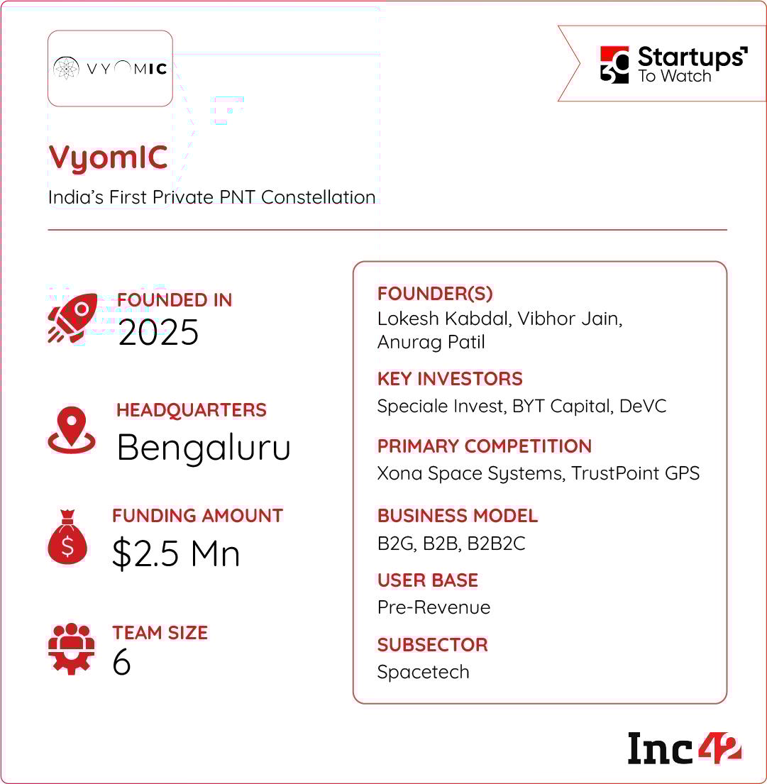 VyomIC’s flagship PNT constellation aims to deliver next-gen navigation worldwide. The startup is also building terrestrial PNT systems for industrial and defence use cases. Its revenue comes from hardware sales, subscription-based secure services, and public-private partnerships.