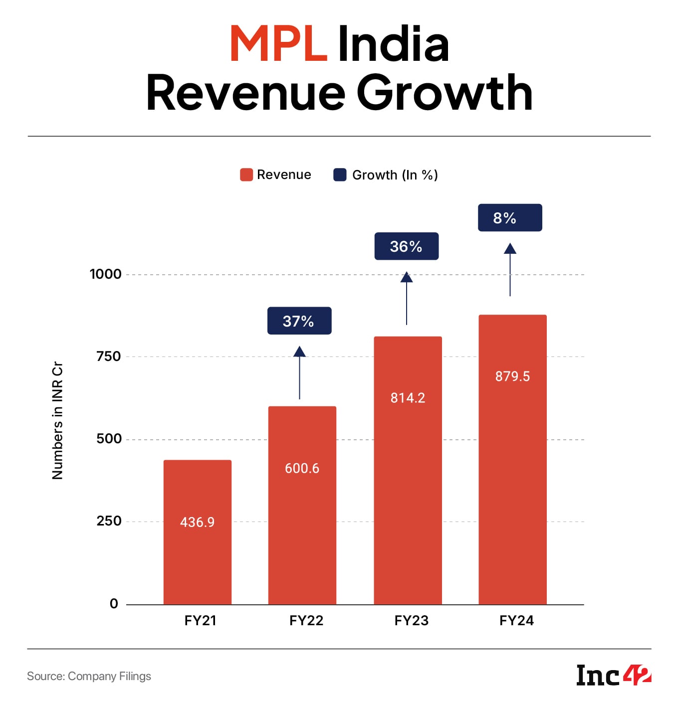 The operating revenue of the Indian entity of gaming unicorn MPL zoomed 8% to INR 879.5 Cr ($ 102 Mn) in FY24 from INR 814.2 Cr ($94 Mn) a year back, according to filings with the ministry of corporate affairs. This excludes its performance in other countries.
