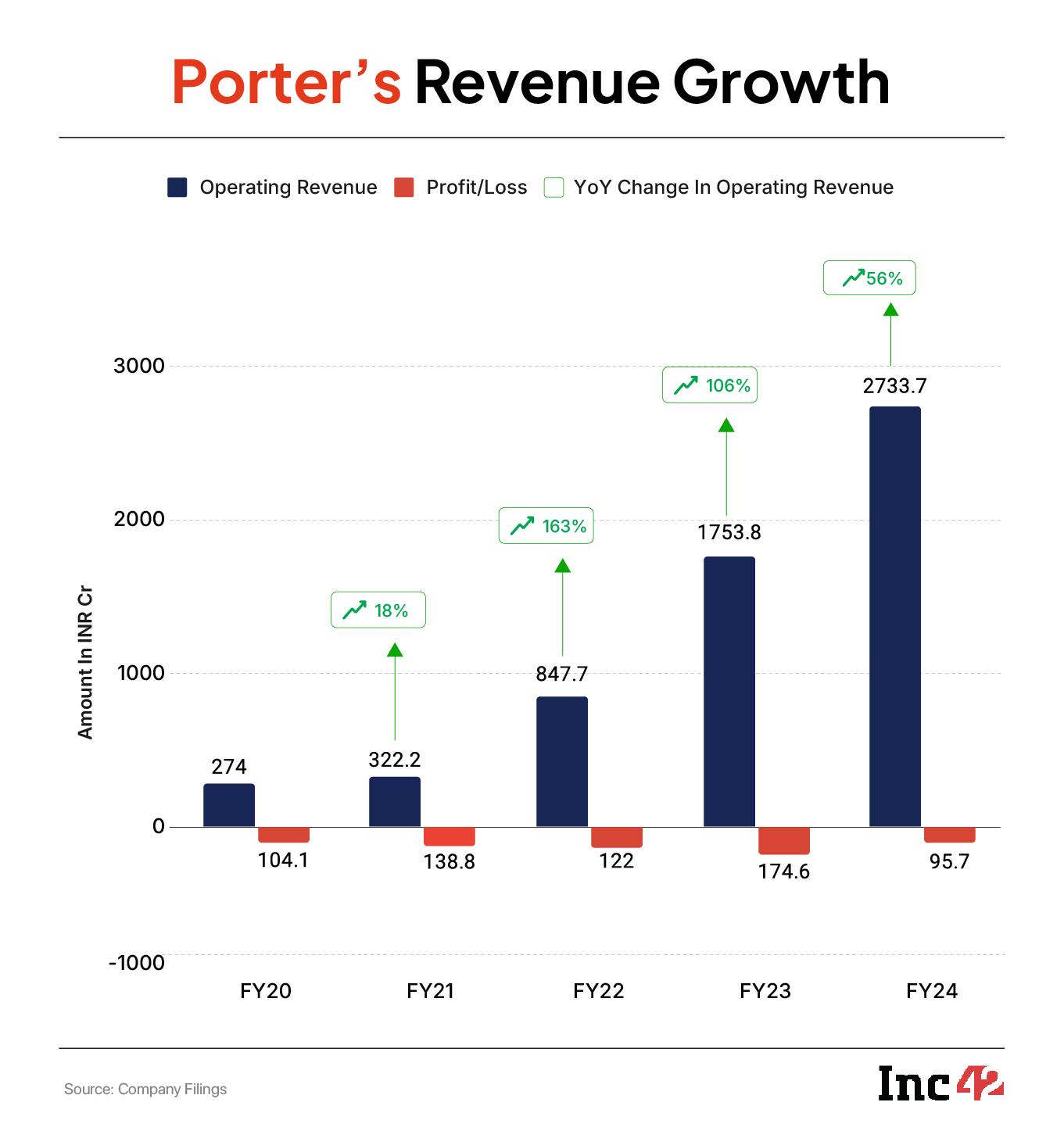 A look at its earlier numbers reveals many interesting takeaways. Between FY20 and FY24, its operating revenue surged nearly tenfold, from INR 274 Cr to INR 2,733.7 Cr. However, the most notable jump occurred between FY21 and FY23, and Porter saw more than 100% YoY revenue growth in FY23 alone. In FY24, this growth rate slowed to 56%, but losses dropped sharply by 45%, falling to INR 95.7 Cr.
