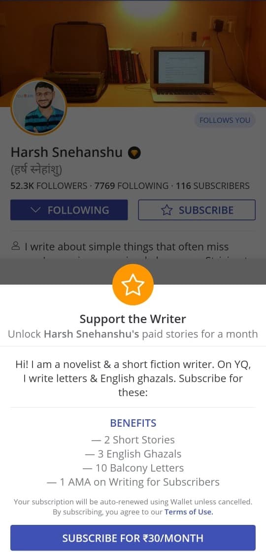 Over time, the premium service brought content engagement statistics for writers, downloadable quotes, and finally micropayments. The microtransactions allow writers to offer monthly subscriptions (INR 20 to INR 100) to their readers or followers and also earn a royalty on paid stories ranging from INR 1 to INR 20. However, writers can only withdraw money from YourQuote Wallet once they have touched INR 1000 mark. The format of the stories could be a typical short story or just quotes created by the author.