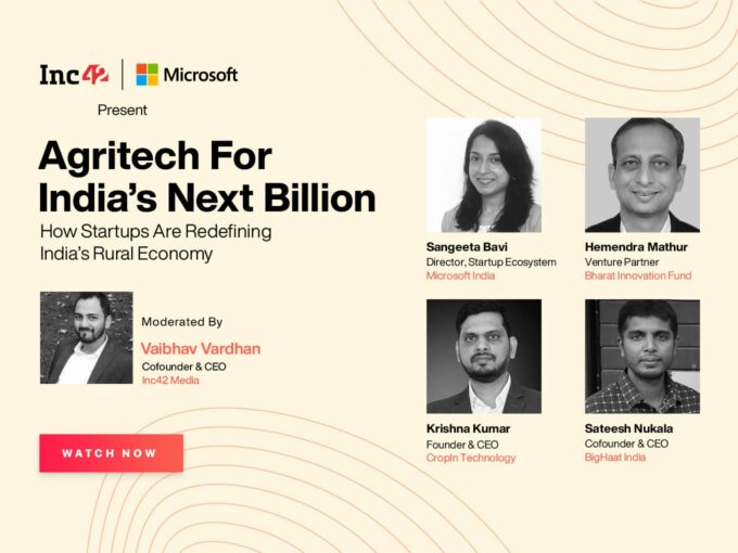 Moderated by the cofounder and CEO of Inc42, Vaibhav Vardhan, the discussion is joined by Hemendra Mathur, venture partner at Bharat Innovation Fund; Sateesh Nukala, CEO and cofounder of BigHaat India; Krishna Kumar, founder and CEO of CropIn Technology; and Sangeeta Bavi, director, startup ecosystem at Microsoft India.